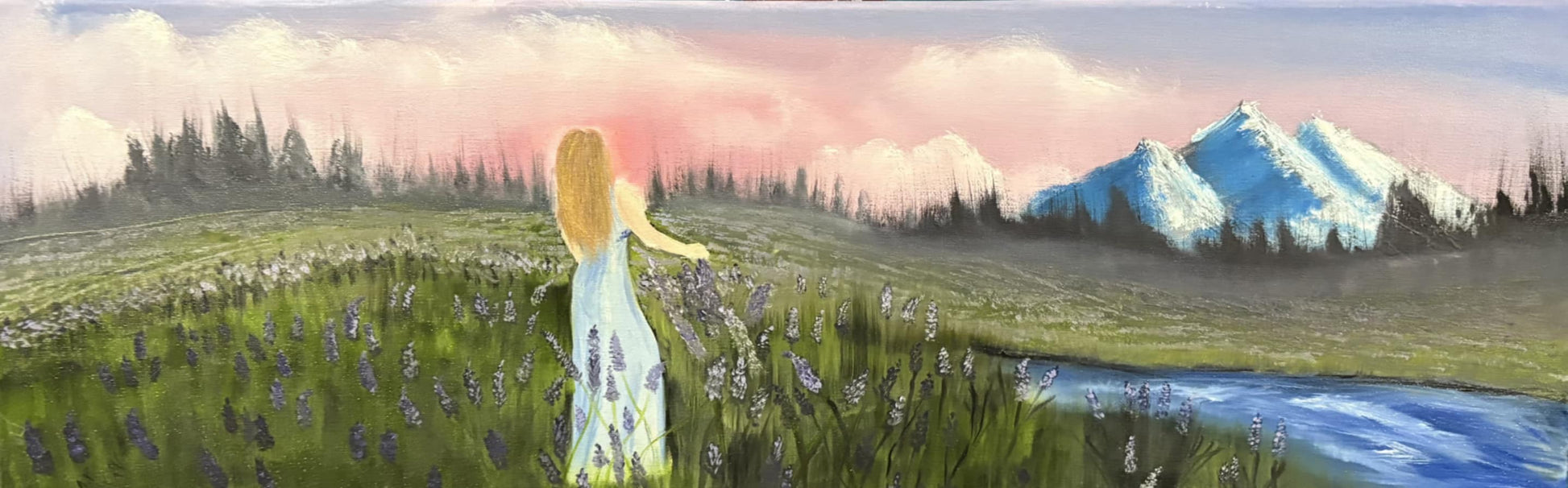 This exquisite 10 x 30 oil painting captures the delicate moment of a woman gently running her hand along vibrant flowers in a lavender field. The elongated canvas emphasizes the sweeping landscape and her graceful movement, bringing harmony between human presence and nature's serenity. Fine brushwork highlights the textures of the blossoms and the softness of her touch, creating an evocative scene that invites contemplation and calm. Ideal for adding a refined, tranquil atmosphere to any space.