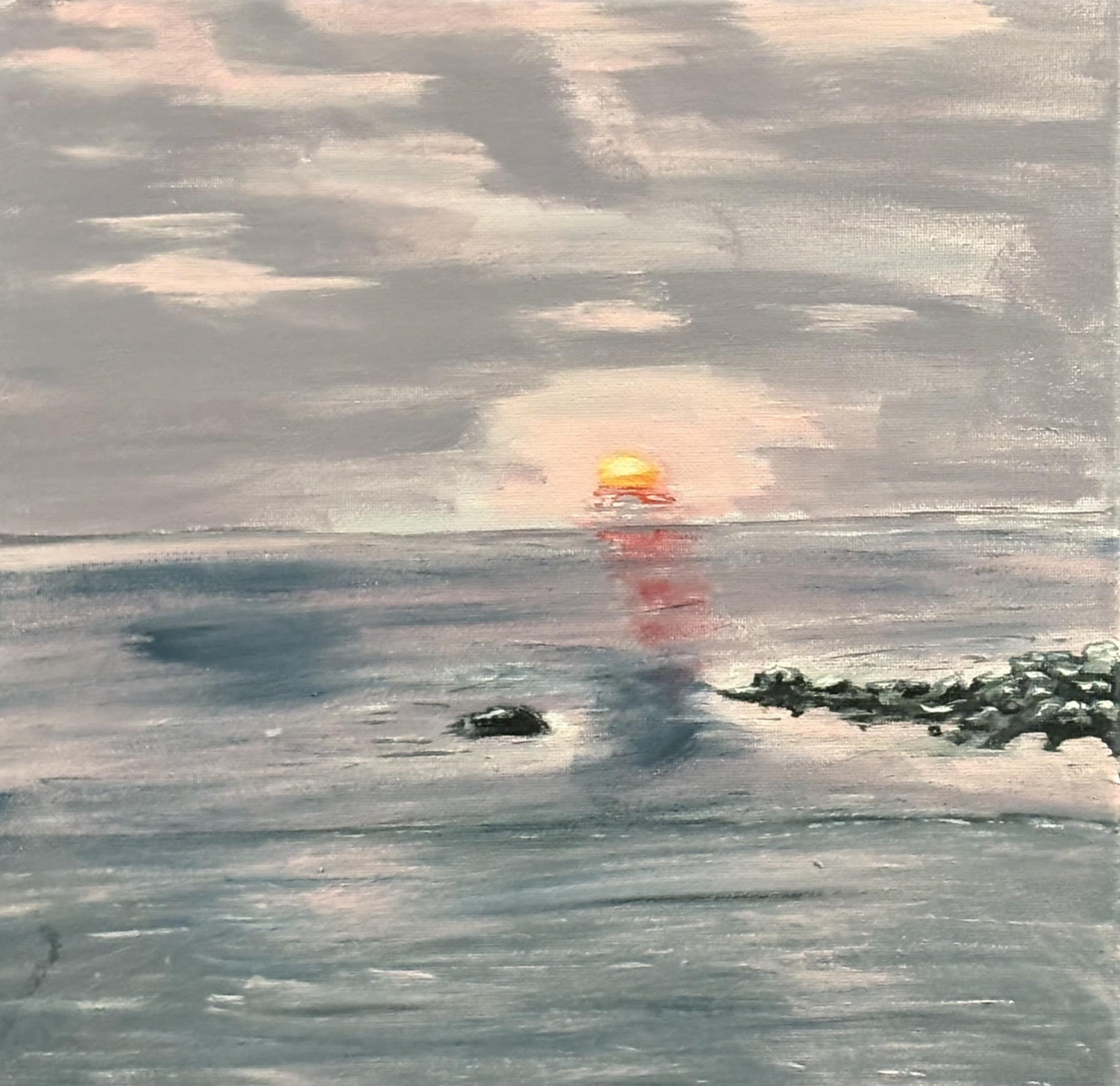 This 12 x 12 acrylic painting captures the serene beauty of a Meaford, Ontario sunrise with expert detail. The piece reflects the tranquil atmosphere of early morning light over the landscape, blending colors to evoke calm and peacefulness. Ideal for bringing a touch of nature’s quiet elegance into your space, this artwork offers a refined and thoughtful representation of a natural moment.