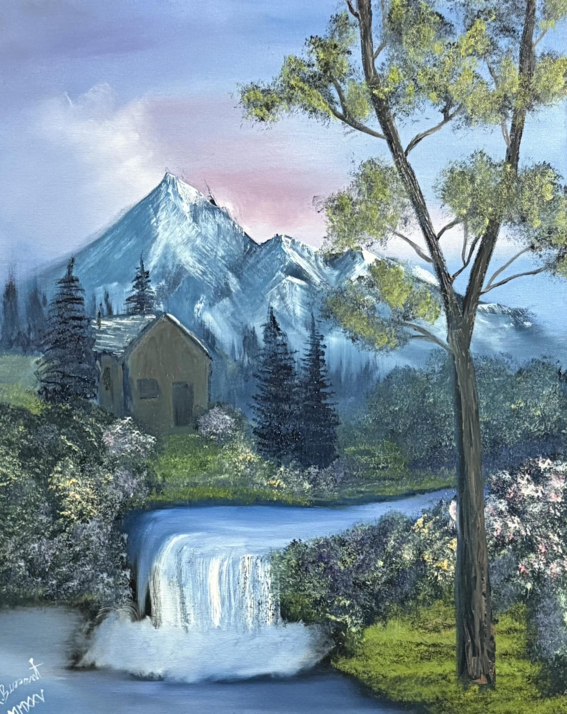 This 16 x 20 oil painting, Spring Escape, captures a serene sunset over a mountain cabin beside a cascading waterfall. The vivid colors and expert brushwork evoke tranquility and connection with nature, making it a perfect centerpiece for any space seeking a refined touch of wilderness calm.