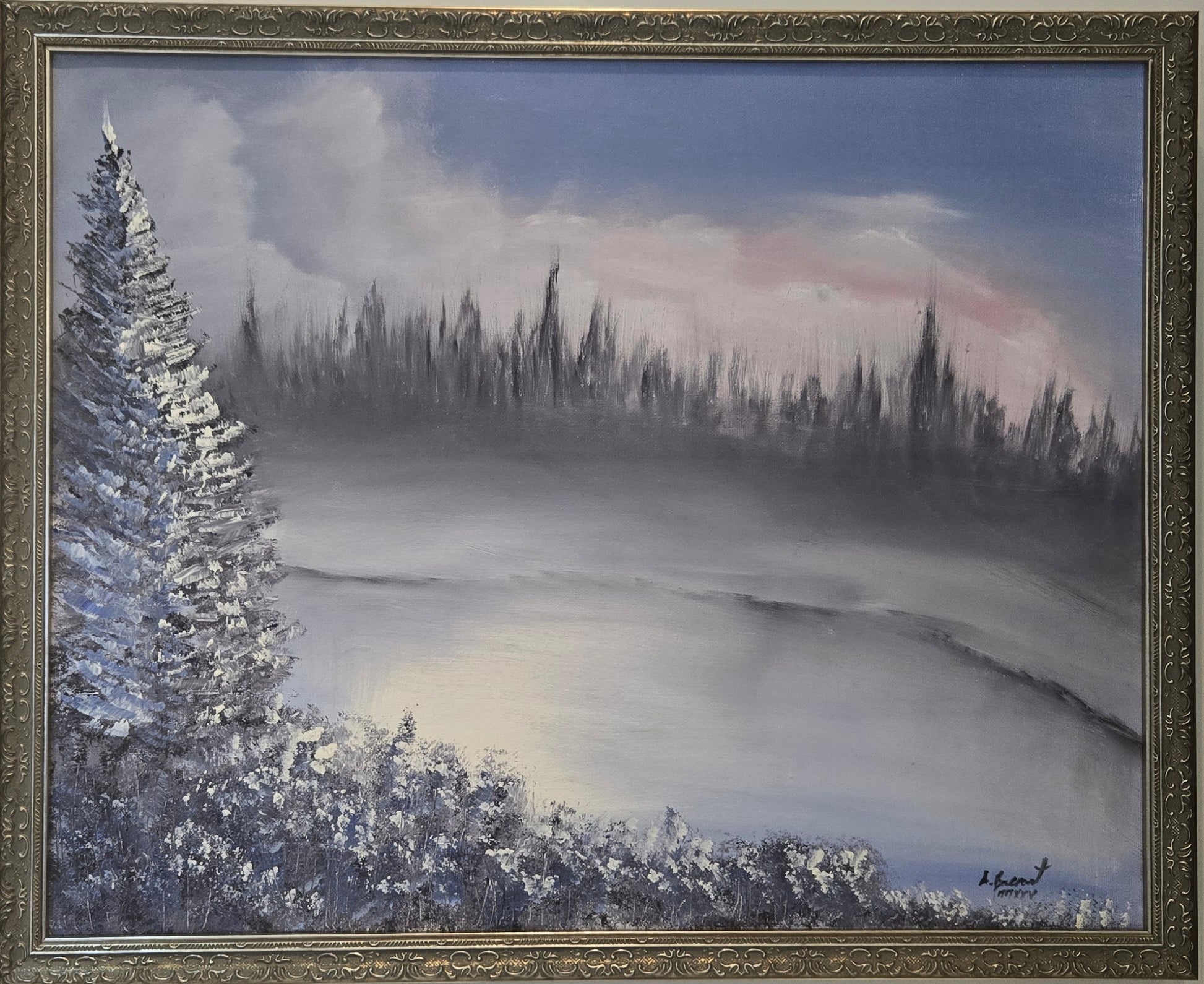 Winter's Peace is a 16 x 20 oil painting capturing the serene beauty of a winter sunset over a frozen lake. Expertly rendered, the artwork highlights delicate light reflecting off icy surfaces, evoking calm and quiet reflection. Its subtle color transitions and textured brushwork bring depth and tranquility to any space, making it an ideal choice for those seeking a refined winter landscape with a peaceful atmosphere.